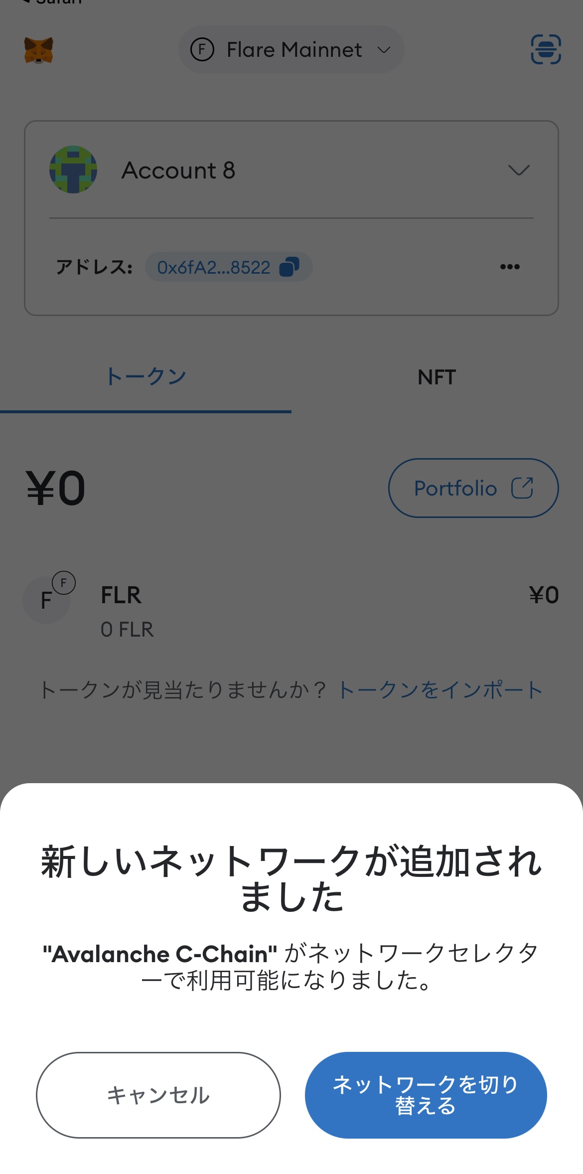 切り替えると画面上やトークンがAVAXになっています。これで無事にネットワークが追加できました。